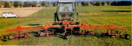 Seitenschwader mit Tragrahme und Achse in der Mitte. Dieser ist an den Unterlenker angehängt. Am Schwenkbock befindet sich 2 Getriebe um den Schwader 90 Grad einzuschlagen ohne Abwinkelung der Zapfwelle. Unter dem Tragrahmen vor und hinter der Achse sind die zwei Kreiselschwader. Die Kurvenbahn läuft in ÖL und ist zusätzlich von oben auf beiden Seiten verstellbar. Das robuste Getriebe hat 11 Arme mit einem Durchmesser von 3m. Die robuste gekröpften Zinkenarme haben 6mm Wandstärke und jeweils 4 Zinkenpaare mit 67cm Länge. Im Kreiselinneren ist ein durchdrehbare, höhenverstellbares Zwillingsrad 16/650-8. Die Achse befindet sich vor dem Schwader : und hat zugleich zwei Tasträder seitlich, dieses gibt auch am Hang ein exakte Bodenführung. Die am Rahmen befindlichen Schwenkarme sind mit Ketten am Schwader verbunden zur besten Bodenanpassung. Ein Gestänge mit Hydraulikzylinder hebt die beiden Schwader waagerecht 50cm aus. Die Achse ist hydraulisch gelenkt und ermöglicht stufenlose Breite beim Schwadern. Auf zwei einzelne Schwaden ist in einer Sekunde umgestellt. Die Bauhöhe der Maschine ist 1.8m. Durch diesen niedrigen Schwerpunkt ist ein umkippen unmöglich.