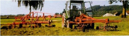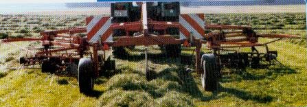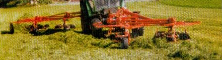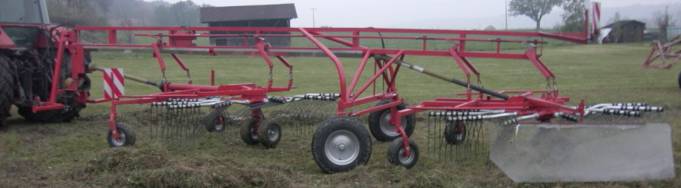 Seitenschwader mit Tragrahme und Achse in der Mitte. Dieser ist an den Unterlenker angehängt. Am Schwenkbock befindet sich 2 Getriebe um den Schwader 90 Grad einzuschlagen ohne Abwinkelung der Zapfwelle. Unter dem Tragrahmen vor und hinter der Achse sind die zwei Kreiselschwader. Die Kurvenbahn läuft in ÖL und ist zusätzlich von oben auf beiden Seiten verstellbar. Das robuste Getriebe hat 11 Arme mit einem Durchmesser von 3m. Die robuste gekröpften Zinkenarme haben 6mm Wandstärke und jeweils 4 Zinkenpaare mit 67cm Länge. Im Kreiselinneren ist ein durchdrehbare, höhenverstellbares Zwillingsrad 16/650-8. Die Achse befindet sich vor dem Schwader : und hat zugleich zwei Tasträder seitlich, dieses gibt auch am Hang ein exakte Bodenführung. Die am Rahmen befindlichen Schwenkarme sind mit Ketten am Schwader verbunden zur besten Bodenanpassung. Ein Gestänge mit Hydraulikzylinder hebt die beiden Schwader waagerecht 50cm aus. Die Achse ist hydraulisch gelenkt und ermöglicht stufenlose Breite beim Schwadern. Auf zwei einzelne Schwaden ist in einer Sekunde umgestellt. Die Bauhöhe der Maschine ist 1.8m. Durch diesen niedrigen Schwerpunkt ist ein umkippen unmöglich.